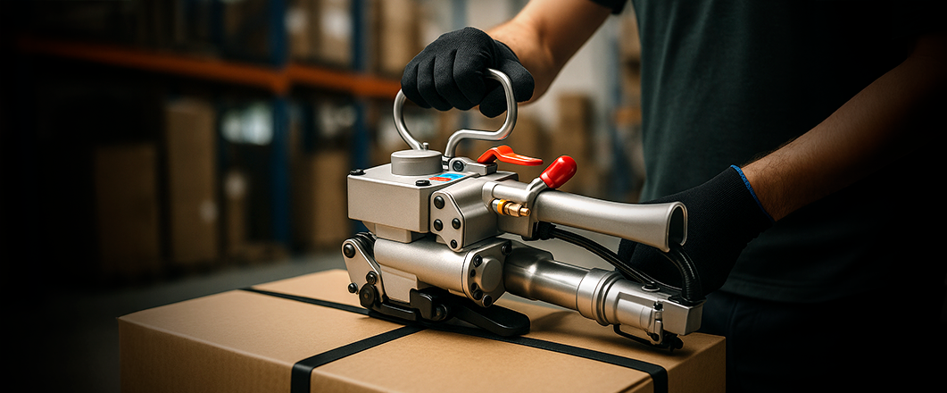 O Arqueador de Fita Manual Pneumático é um equipamento prático e eficiente, projetado para esticar, selar e cortar fitas PET, dispensando o uso de selos metálicos ou fivelas plásticas. Isso garante maior agilidade, economia e rendimento nos processos de embalagem.