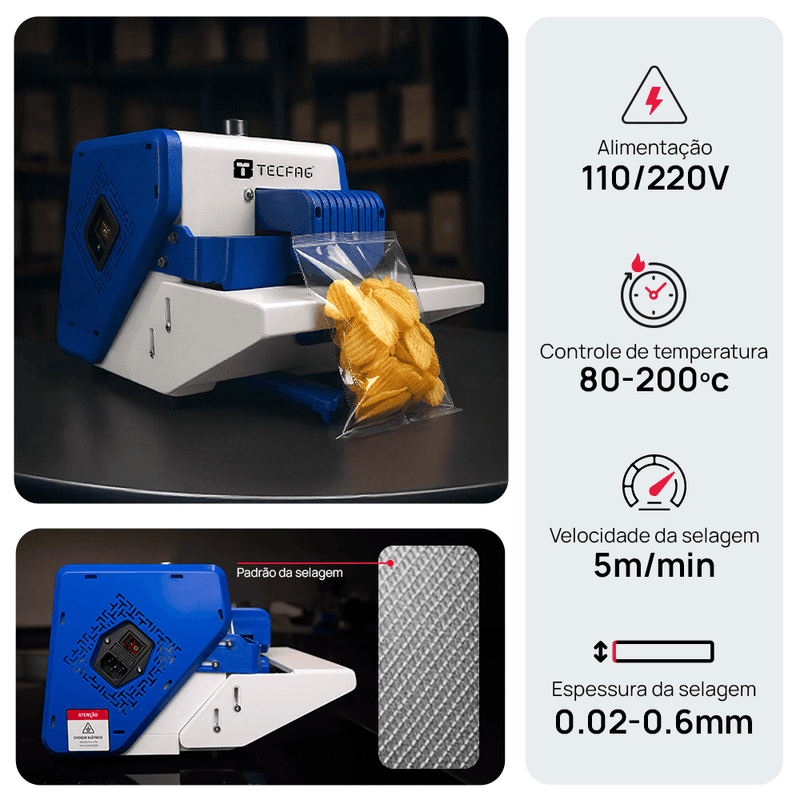 A Seladora Contínua Portátil TC-20 é uma máquina compacta, capaz de selar até 2500 embalagens por hora de forma contínua. Por ser leve, é simples de transportar e pode ser operada em qualquer local com acesso à energia elétrica. Ela é ideal para selar em pequena escala.