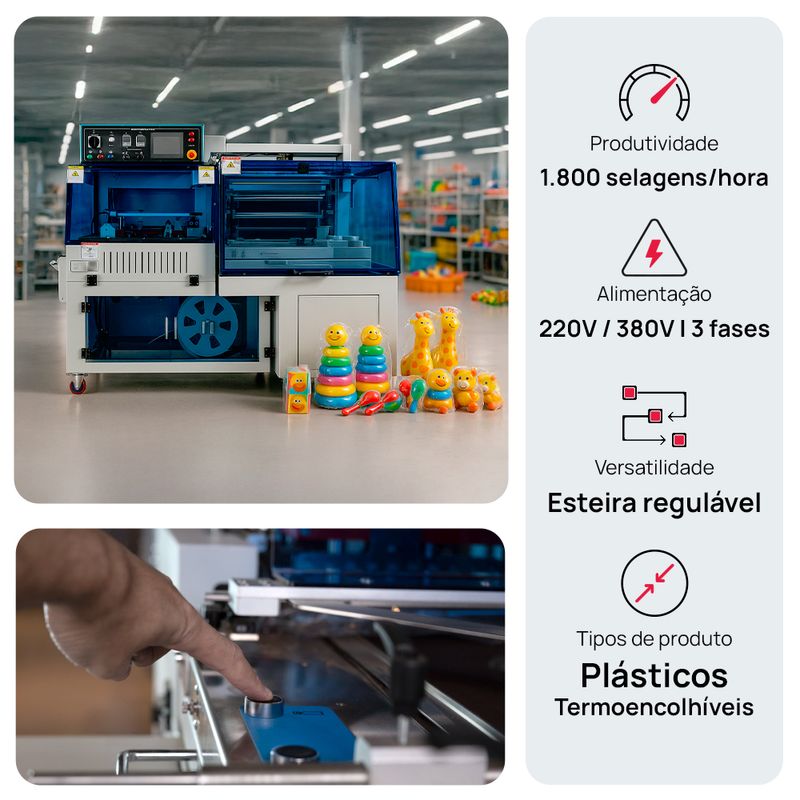 Com proteções integradas e alarmes de segurança, a máquina garante embalagens uniformes e confiáveis. Quando acoplada a túneis de encolhimento, adapta o plástico ao formato do produto, reforçando a apresentação profissional e a credibilidade da marca.